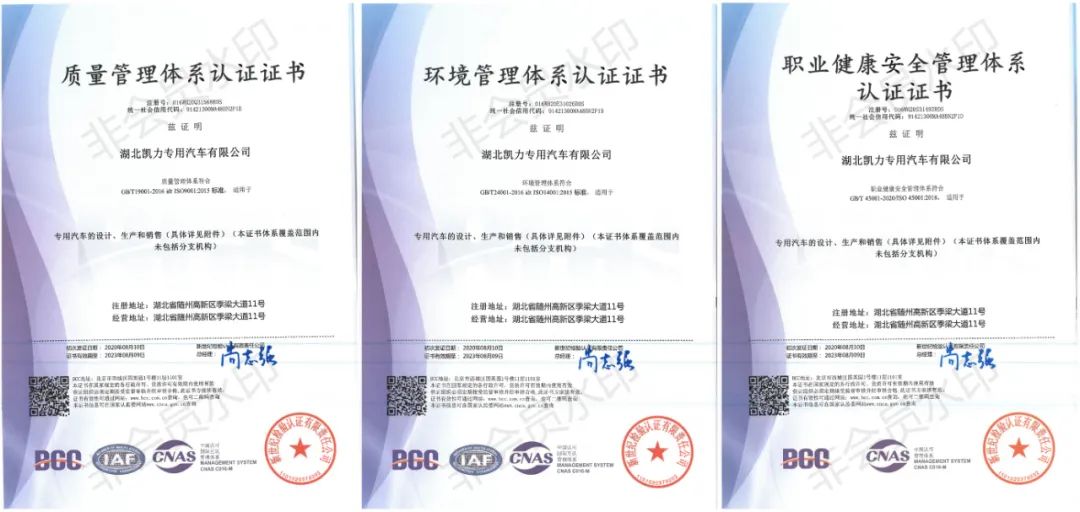凱力專汽不斷地優(yōu)化管理,持續(xù)改進(jìn)機(jī)制。順利通過(guò)“三體系”(質(zhì)量管理體系、環(huán)境管理體系、職業(yè)健康與安全管理體系)認(rèn)證。